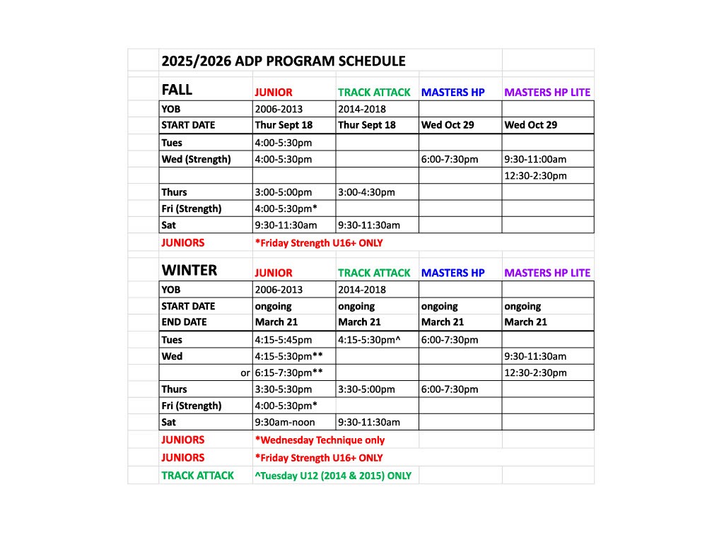 - expert club coaching available to all ADP and Masters athletes